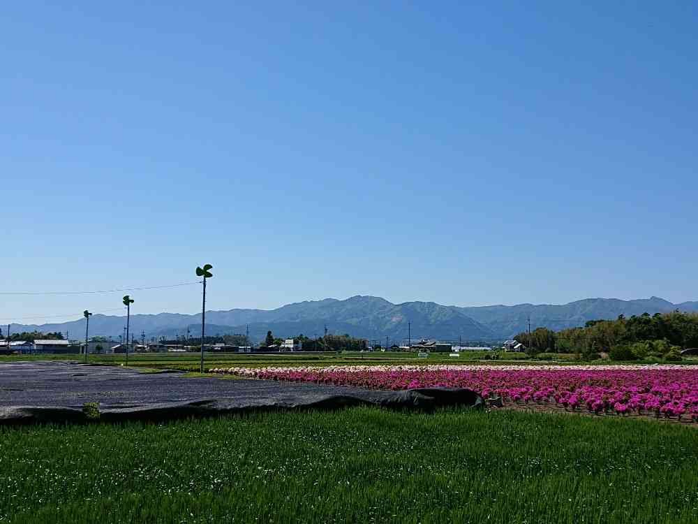 黒いものは地元のお茶「かぶせ茶」、お茶畑に立つ扇風機、ピンクと白のツツジの苗木、雲ひとつない青い空…