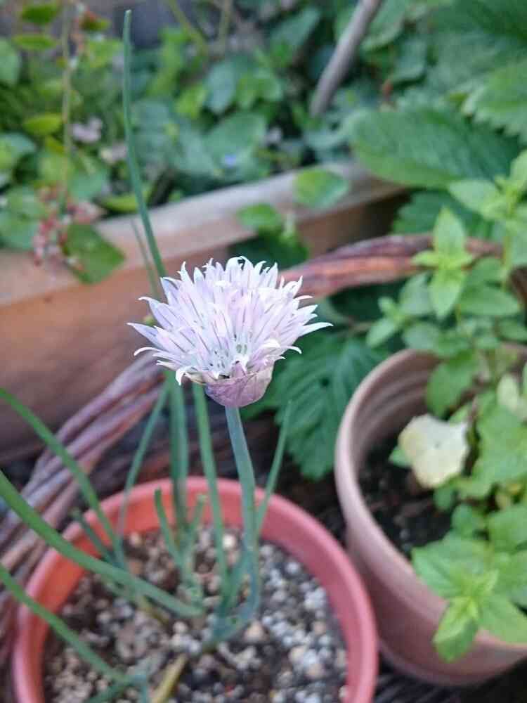 葉っぱをちみった跡が丸見えですが、チャイブの花は本で見た通りの可愛らしさでした😃