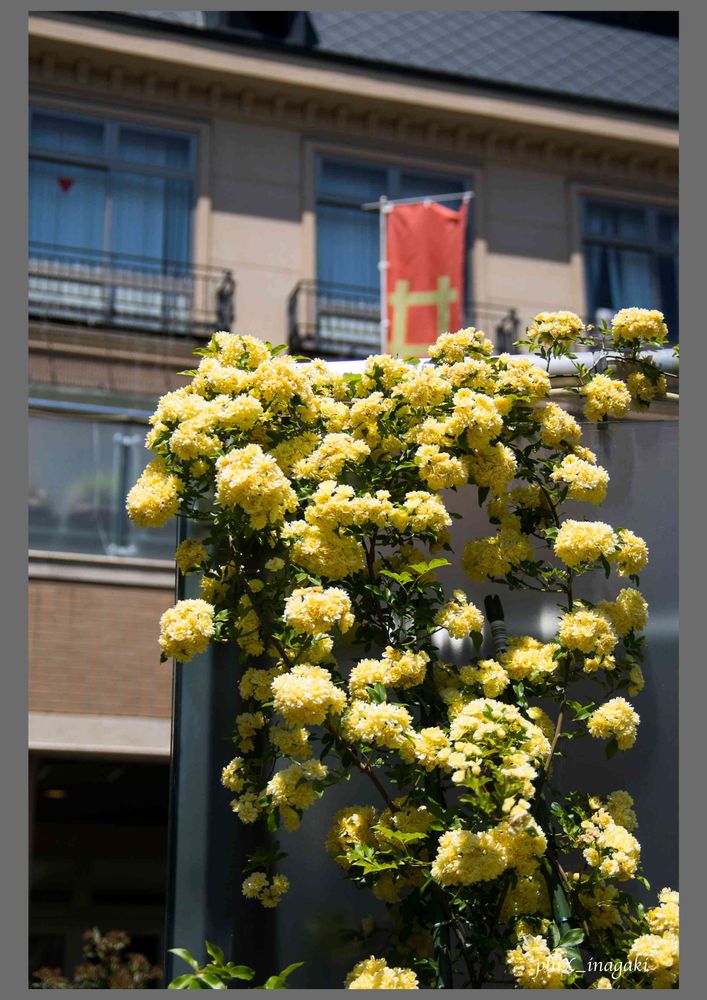 彦根の街の目抜き通り。しゃれた洋館風の街角にモッコウバラの黄色い花が似合います。