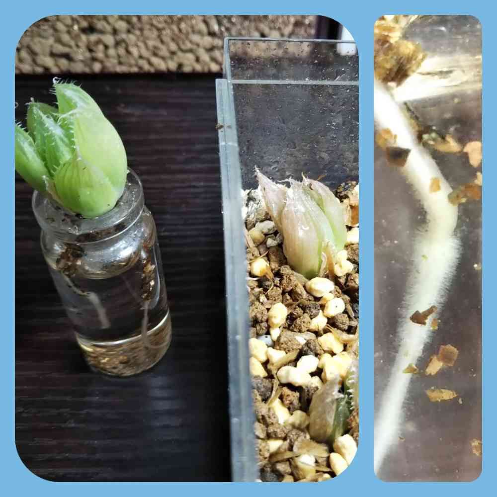 色が変わったので、1株を水耕で給水させます。緑に戻りますね。根も根毛が給水を促進させます。