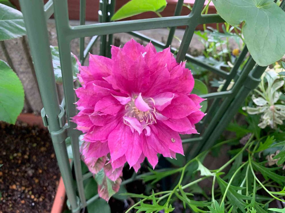 バラの鉢と鉢の間に置いている日陰の環境のクレマチスのレッドスターさんも開花しました。