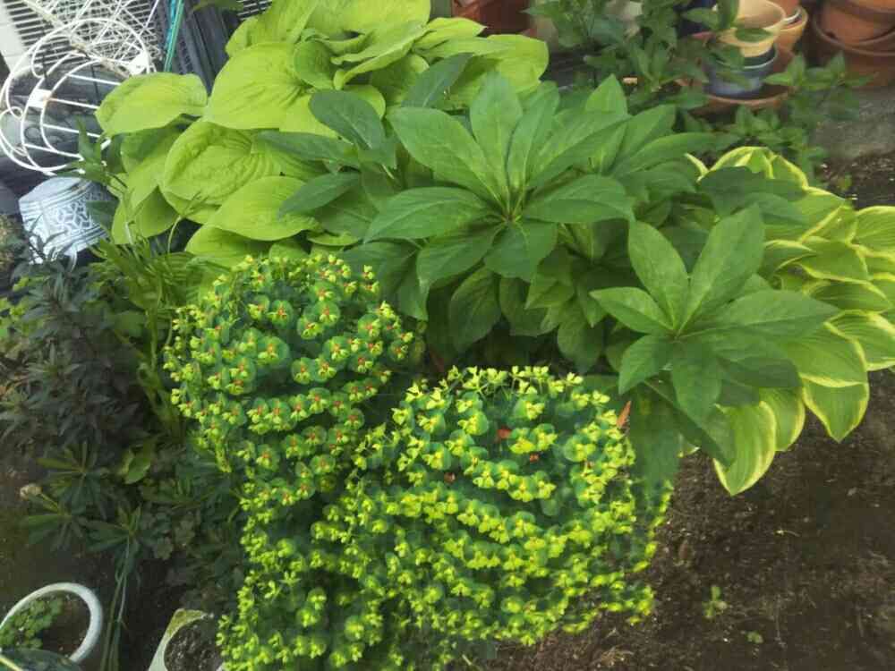 鉢やカゴなどの資材を置いてる場所の近くは鉢に植えてある花の待避場所です☺花が終わったクリスマスローズ、風で倒れてしまったユーフォルビア、芽が全く出てなかった2種のギボウシ。