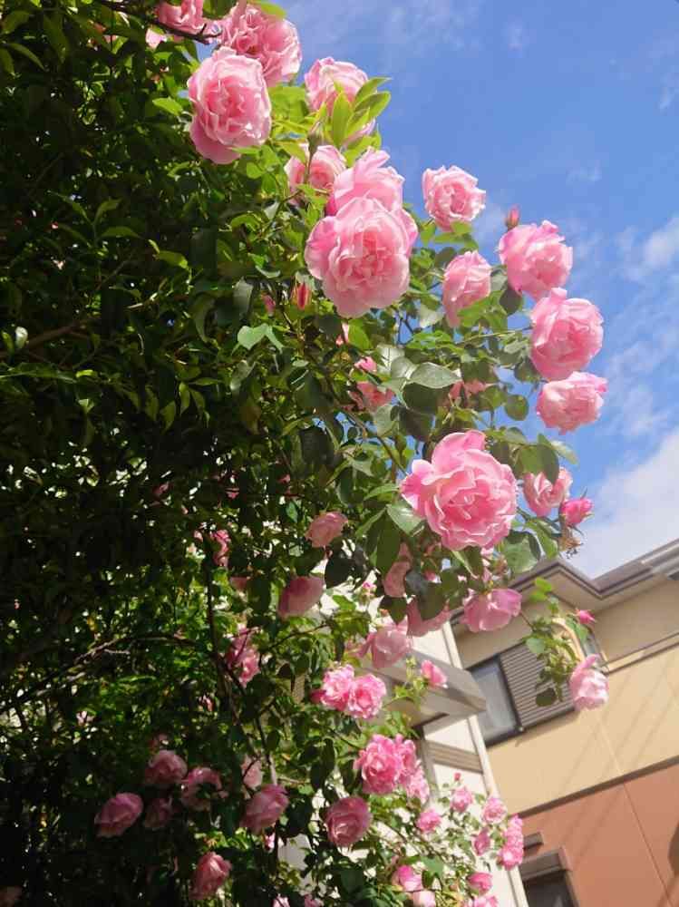 青空に向かってピンクの薔薇、素敵でした🌸🎵