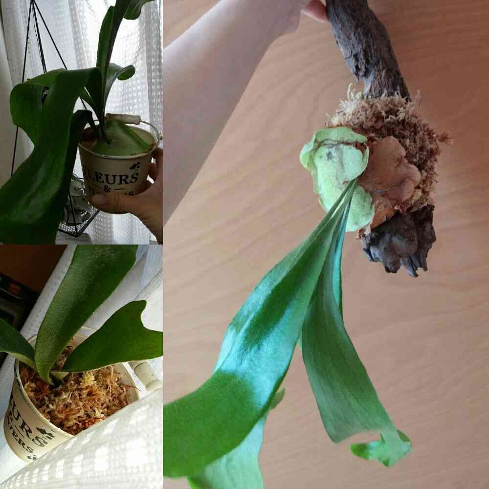 苔玉で買ったコウモリランが葉っぱが1枚になり諦めかけて、最後の望みで思い切って植え替えた。(左下)