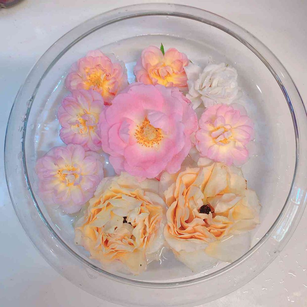 咲き終わりそうなミニバラ を摘んで来てガラスの器に入れてみました。これでもう少し楽しめます❤️