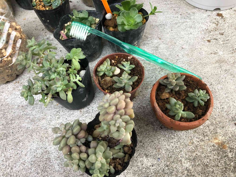 他にも子持ち蓮華ちゃん、玄海岩蓮華さん、やられてまして💦💦 こちらも歯ブラシでお掃除して。混み合ってるところを植え替えしました。