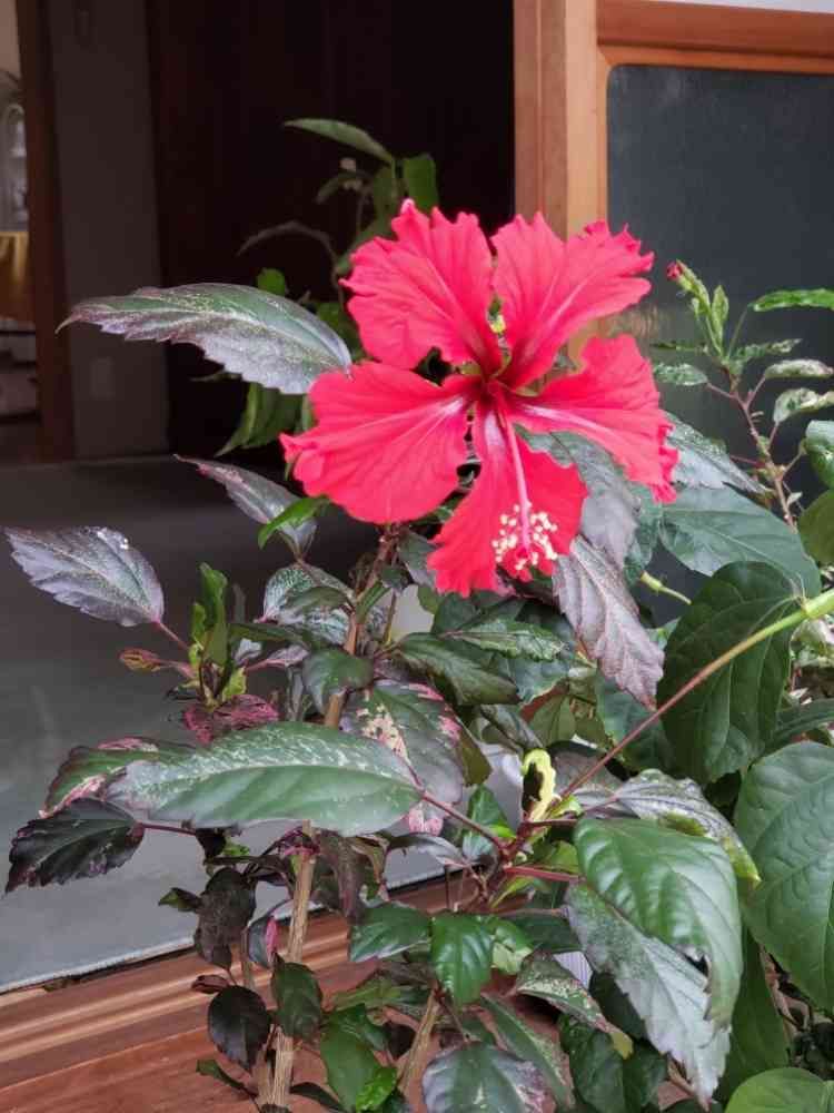 越冬した班入りハイビスカスが咲きました。昨年買ったハイビスカス五つ、全部が越冬を果たしました。