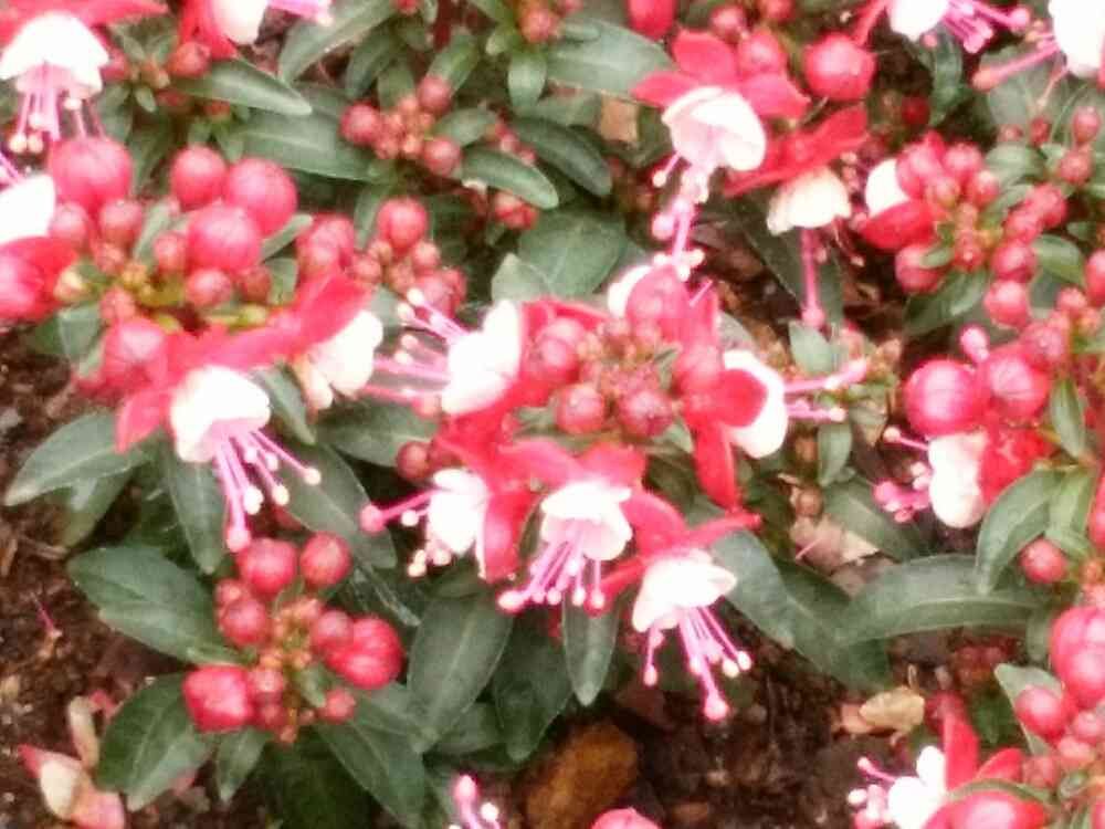 フクシアでしょうか?こんな風に地べたで咲いてるの見たことないので自信ないけど😓