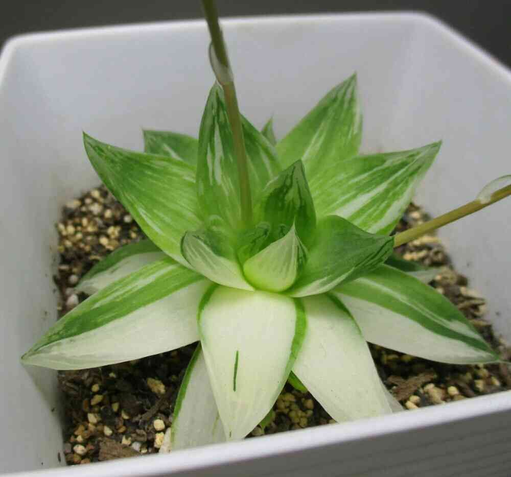 今年のこの株は,株の半分近くが白地で,その一葉に一筋,グリーンのラインを付けた姿が、新緑の瑞々しい、爽やかな姿を魅せてくれてます。