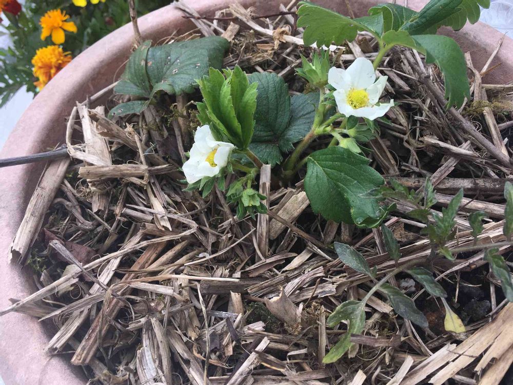 庭の片隅で3枚の葉を一生懸命広げていたイチゴの苗1株。見つけてすぐ大きめの鉢に植え替えてから1ヵ月半、最低気温3 ‐ 4度にも関わらず元気に花を咲かせてくれました😍!一応人工受粉は試みたのでどうなるか楽しみ!隣は先月の寒波でほぼ全滅したミニトマトの苗のうち1つだけなんとか生き残った株です😊