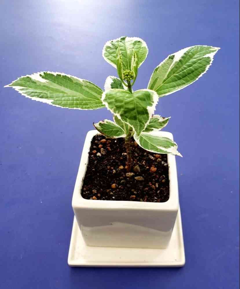 ふ入り紫陽花の挿し木を育てていたら蕾がついたので、3号鉢に植え替えてみました。