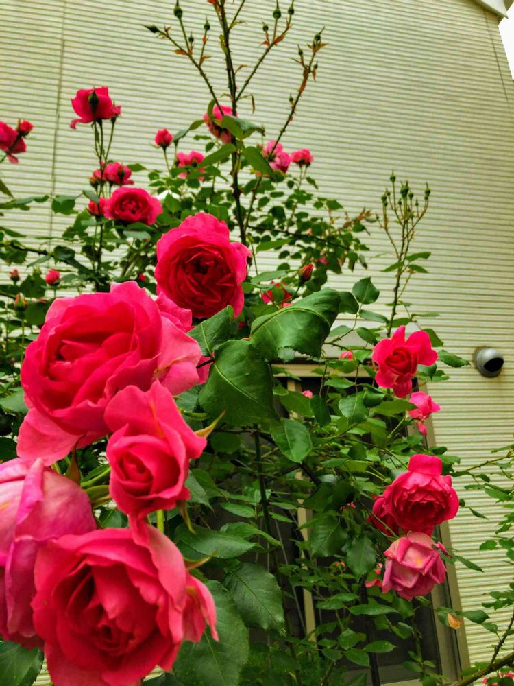 お隣さんの方に行かないように麻ひもで結びました。🌹🌹🌹