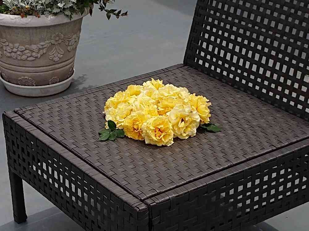今日は風が強く、散った花びらでバルコニーの掃除が大変になる前に、少し早めに咲ききったバラの花を摘みました。捨てる前に並べて撮ってみました🎶