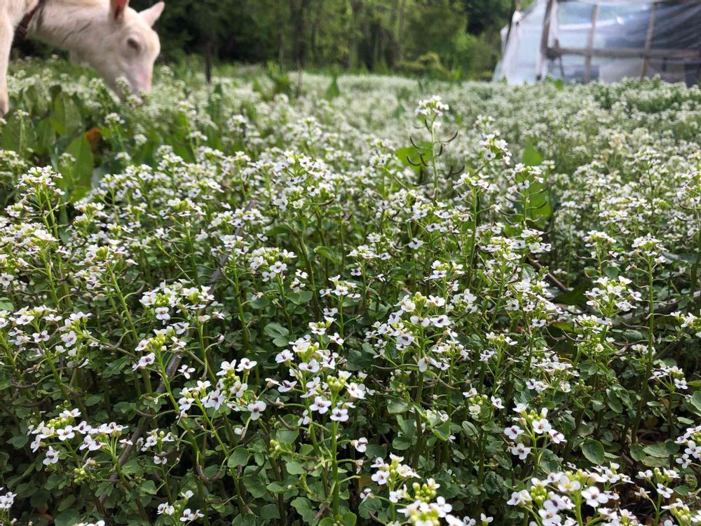 クレソンが満開。白い小さな花とヤギさんに癒されてます🐐