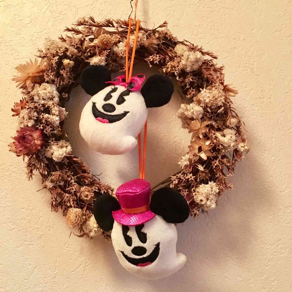 十年物のドライフラワーのリースだけどハロウィン👻のマスコットたちでちょこっと可愛いく見えるかな⁇
