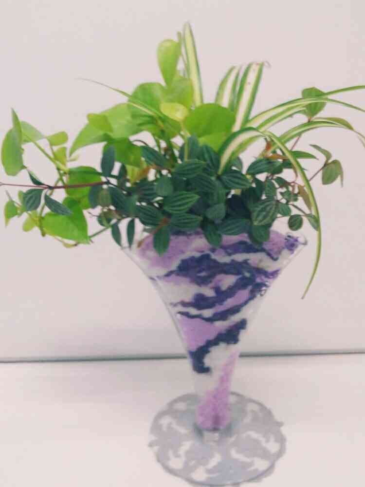 水につけておいた観葉植物に根が生えて来たので、アート水苔の3色を使ってガラスの花瓶で寄せ植えを作ってみました。