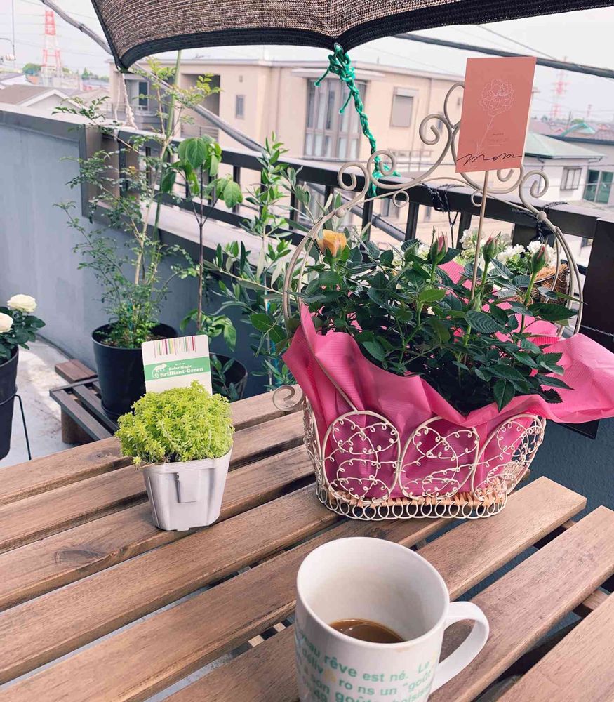 母の友人へ贈るミニ薔薇とセダムを眺めなからバルコニーにでコーヒー☕️ブレイク♬