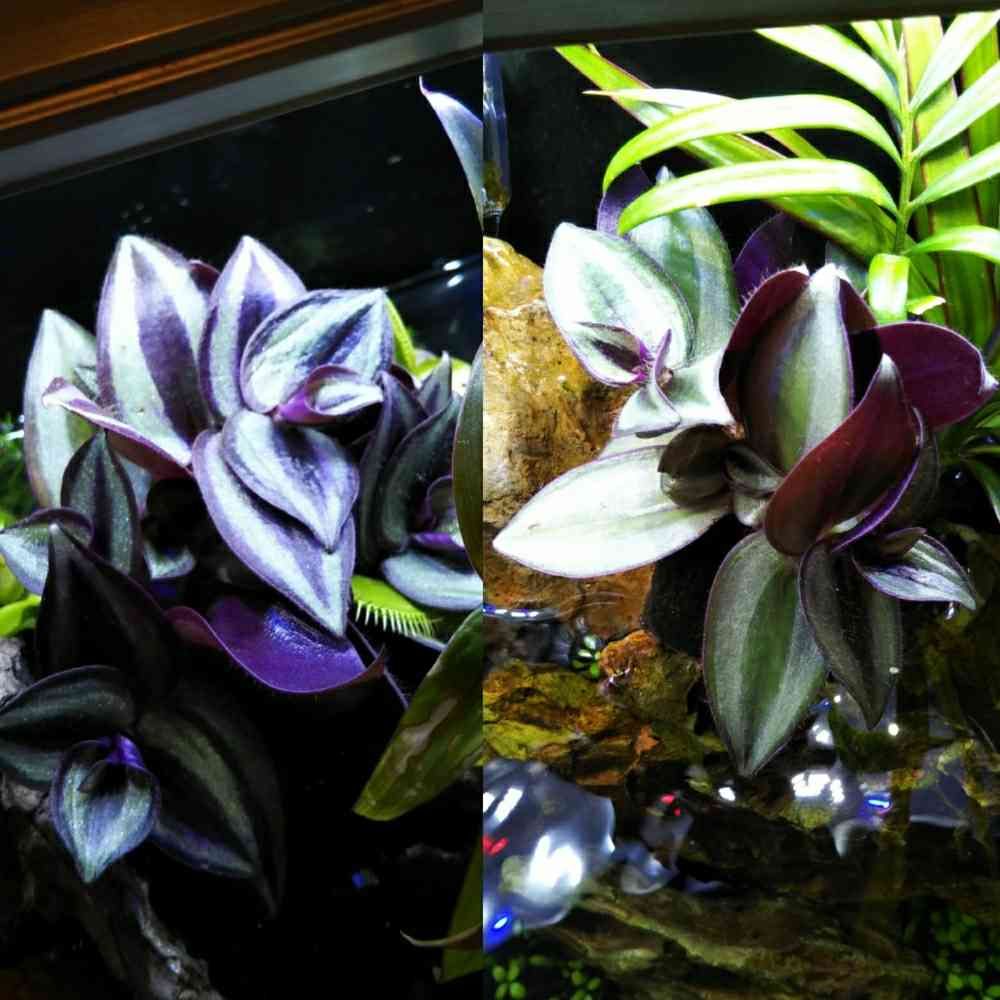 ちょっとわかりにくいかもですが、同じ日に買ったトラデスカンチアを、左は水槽のLEDの下に置いていたもの、右は照明が直接当たっていなかったものです。