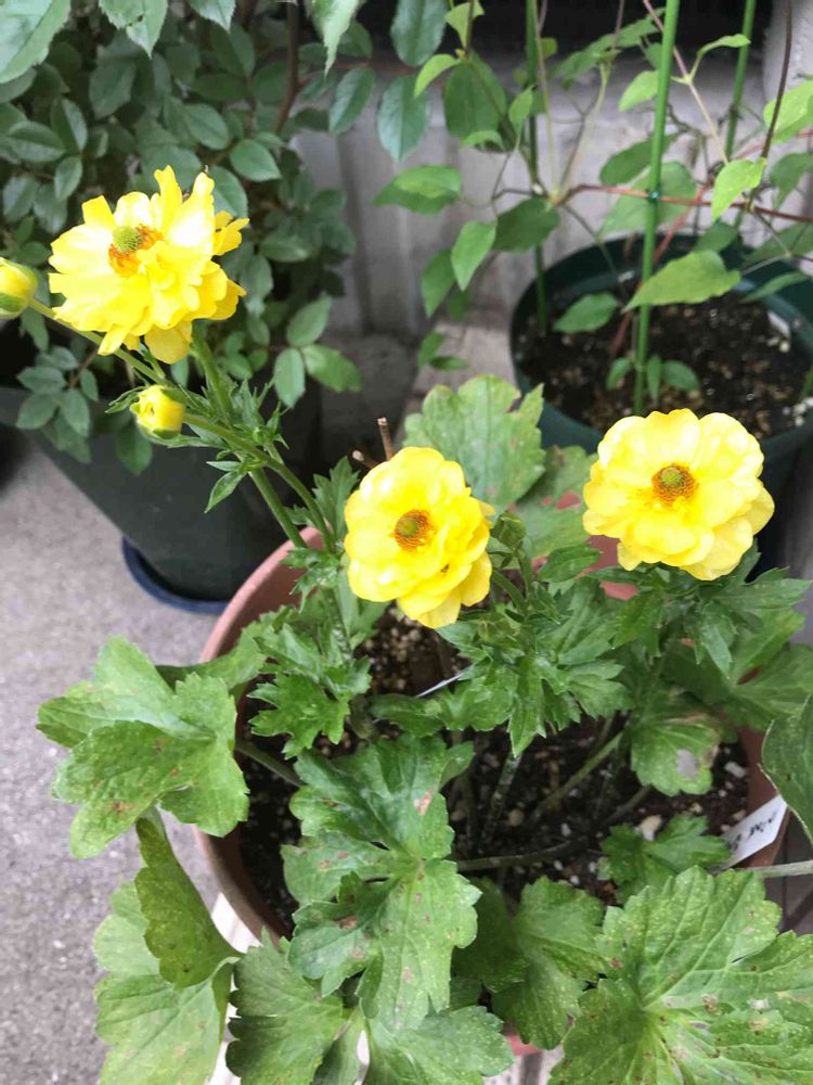 暖かくなり、1回枯れかかったが、復活して開花したラナンキュラス・ラックスシリーズのピュタロス