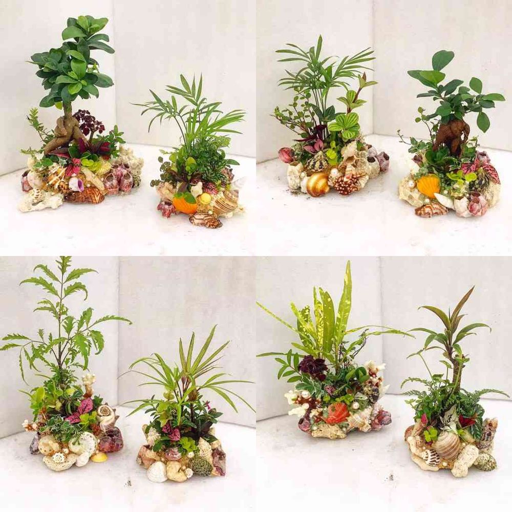 貝殻と砂利を樹脂で固めていろいろな鉢を作っています。 また、ロックウールを使った誰もが簡単にできる寄せ植えを紹介しています。