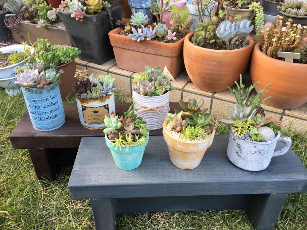 今日は、出来上がった台に寄せ植えを並べてみました😉