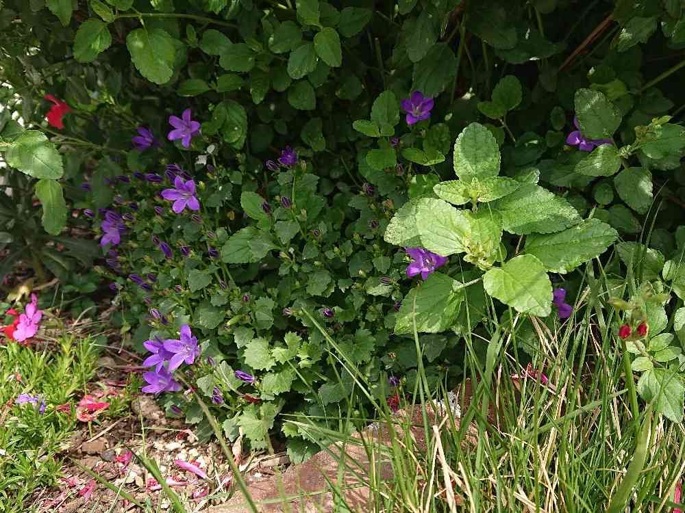 チェリーセージの陰に隠れて今年もひっそりとベルフラワーが咲きました。