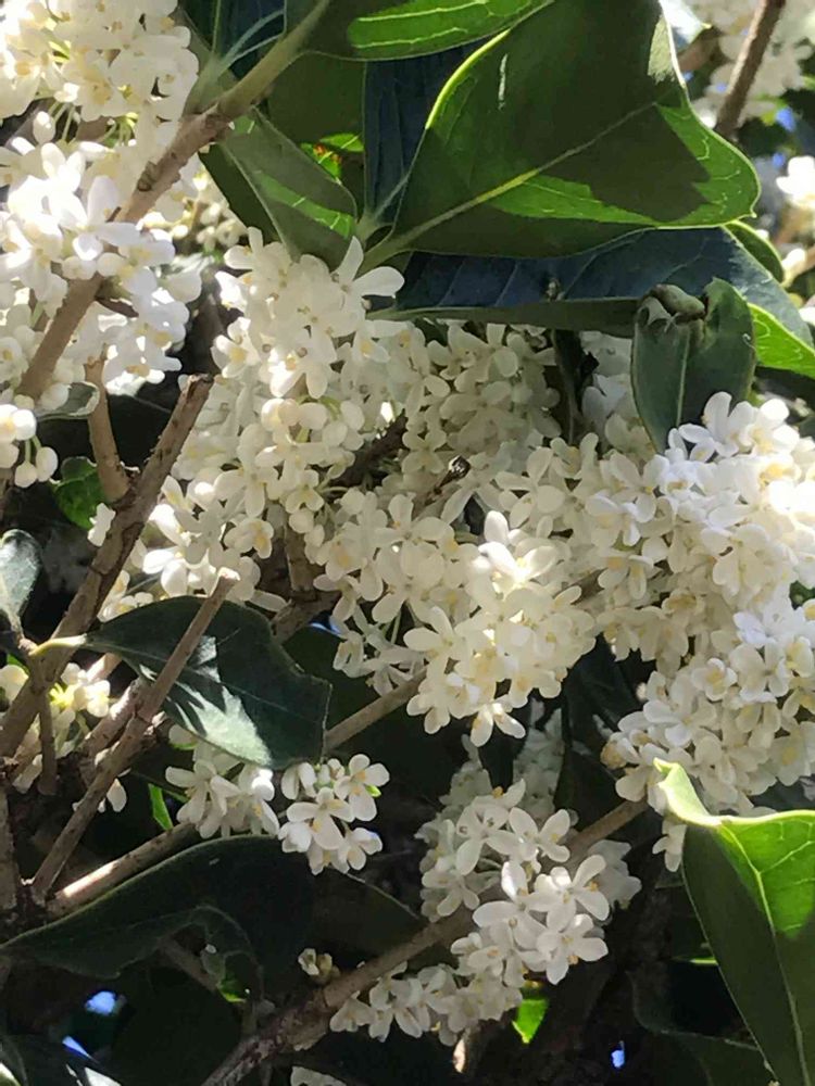 この花はヒイラギモクセイだったことが判りました💦銀木犀は少しクリームがかった花でした
