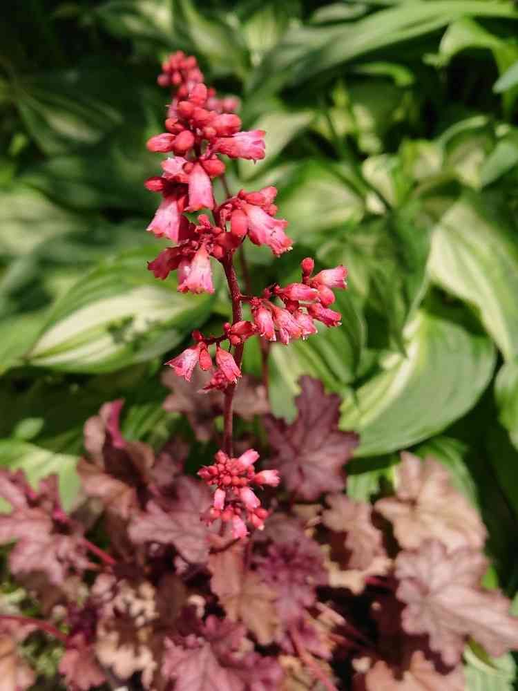 ヒューケラって葉っぱの色が違うと花茎の色も変わるんだょね!