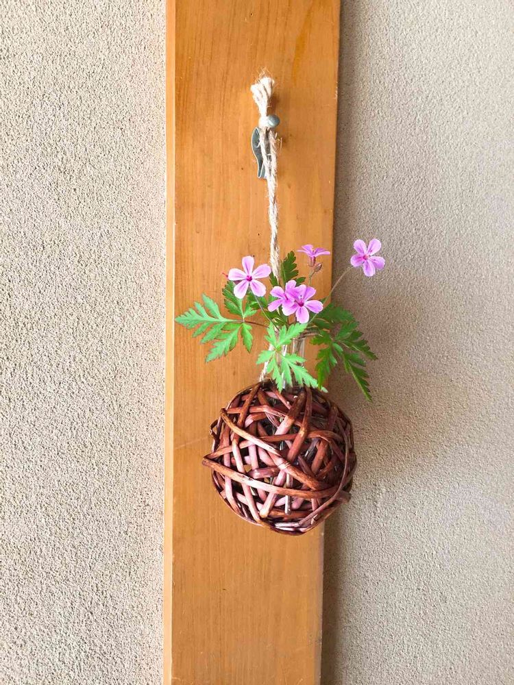 ありがとうございます❣️100均一の籠に細い瓶を指して作った花器ですが、自然の素材なので草花を合わせやすいです😊