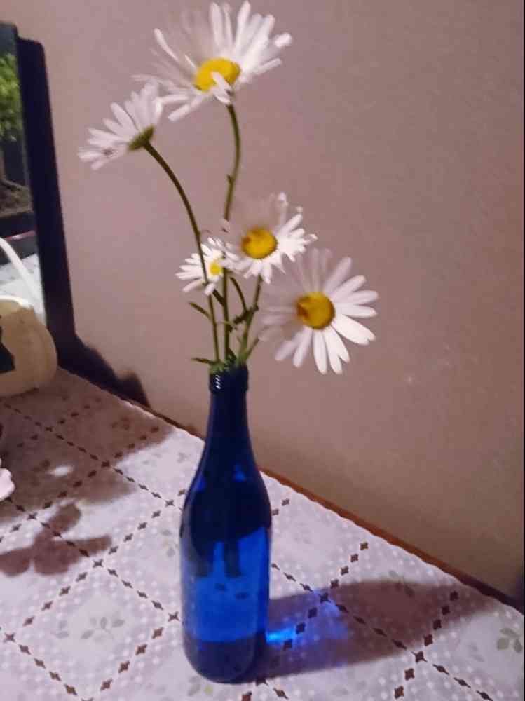 畑に咲いていたフランスギクを 日本酒の空き瓶にさしてみました。