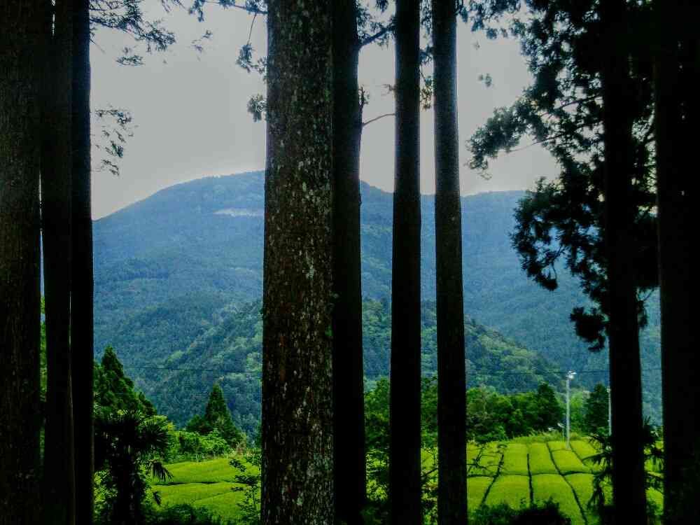 高い杉林の薄暗い中から見る山々やヤマシタさんちの新茶がまぶしい