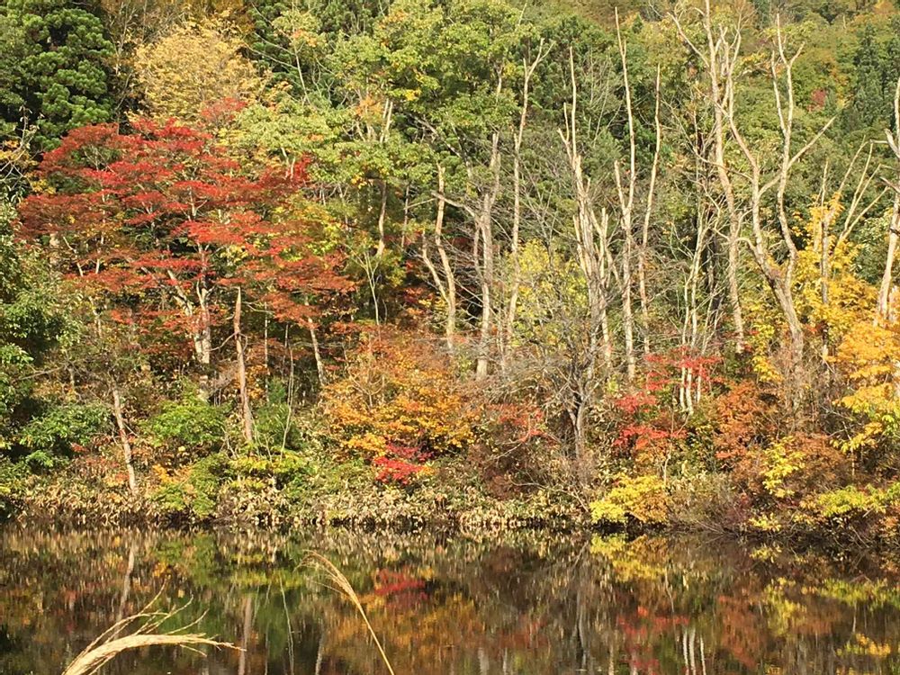 山頂は雪、山肌、紅葉、針葉樹って遠くでも目で確認できる☺
