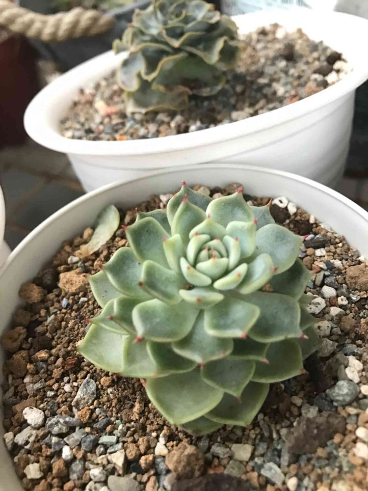 50円で買った名無しのエケベリアさん。もっとしなっしなだったのが立て直し、爪が赤くなってきて可愛いい❤️