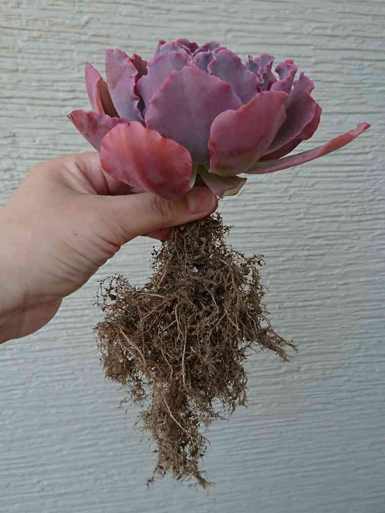 ビスタさんの多肉ちゃんを雨どいプランターに植え替えるため、土をほぐして根っこの整理をしてます🙋