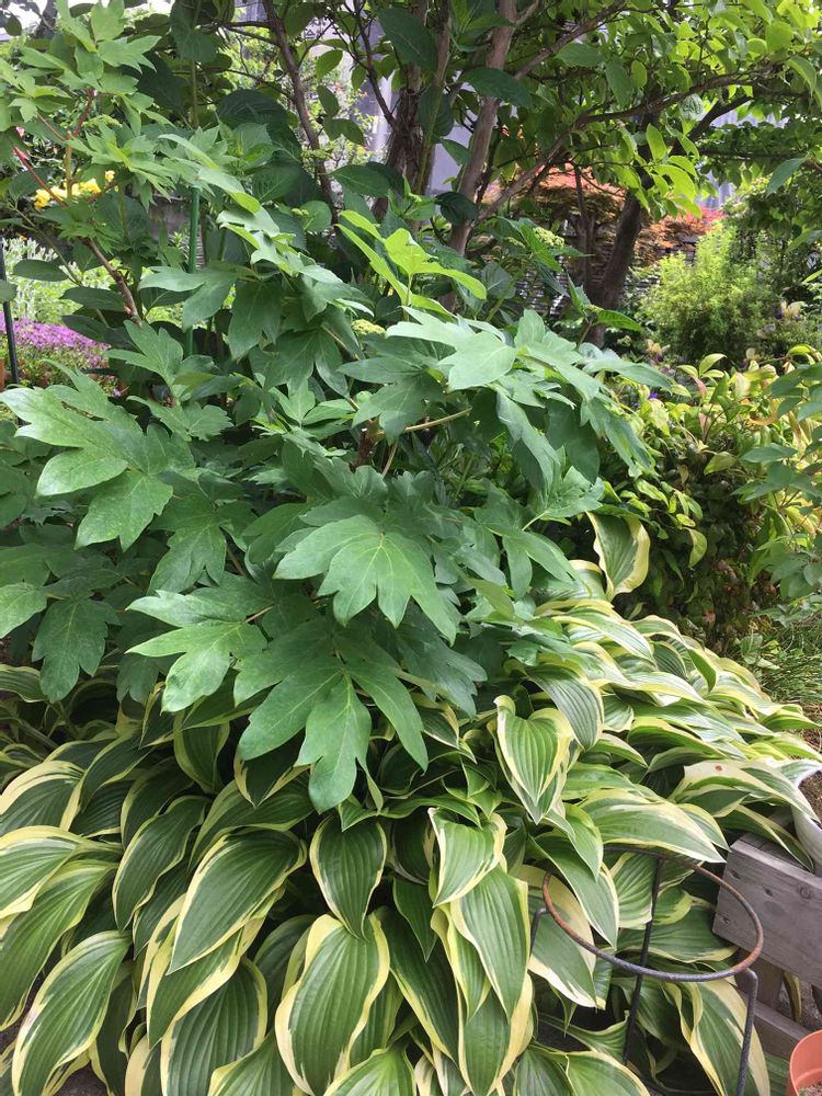 新緑がまぶしい!上の方にはアジサイの蕾が少し写っています。もうすぐ梅雨の時期ですね🌲