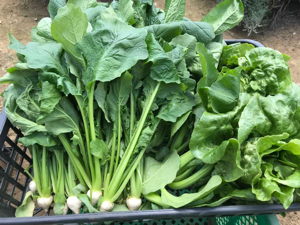 新鮮なので、味付け控えめにレタスサラダ、カブは葉っぱも炒めて、小松菜はお浸しでいただきました。おいし😁
