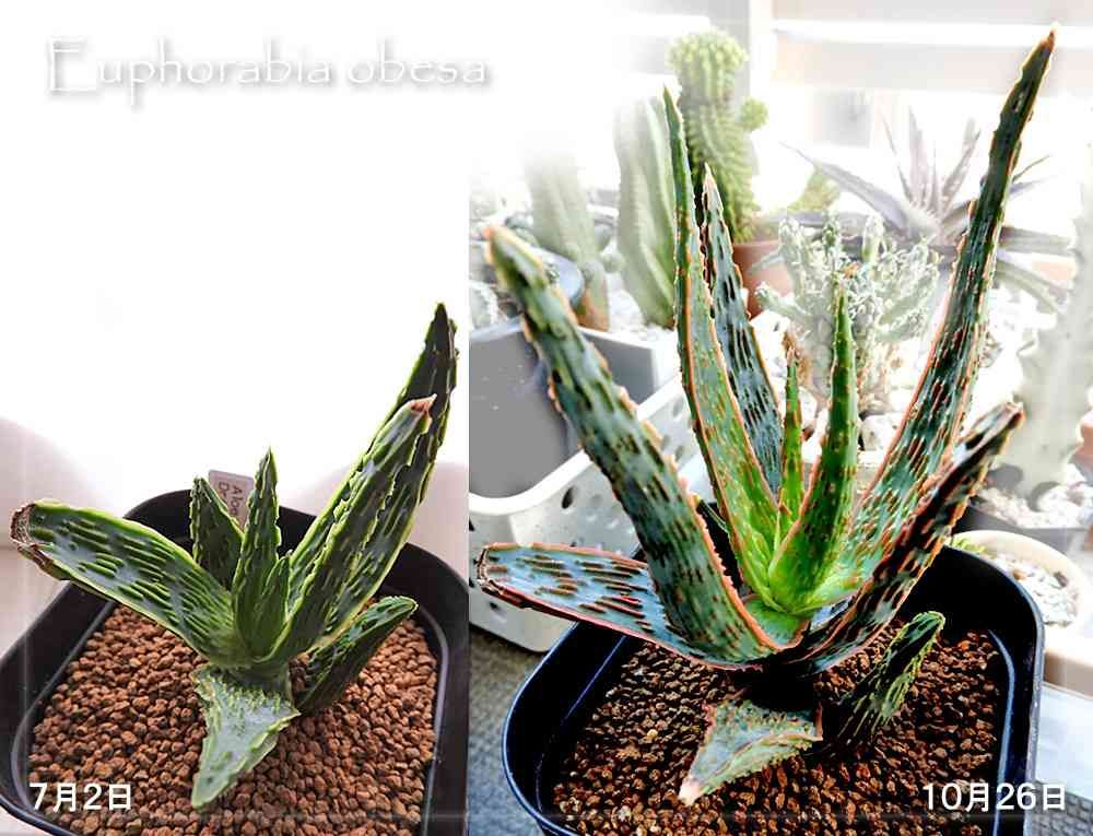 アロエ、ドラキュラズブラッド。我が家にやって来て約3カ月半。偶然最初と同じ角度で写真を撮ったので比較してみたら予想以上に成長してた! ノギや葉の模様も赤みを帯びてきたし、いい感じ……だけど、新葉のあたりが黄色っぽすぎるなあ。もっと葉も青黒くなってほしいのでせっせと日に当てているけど、寒くなると紅葉するだろうか。