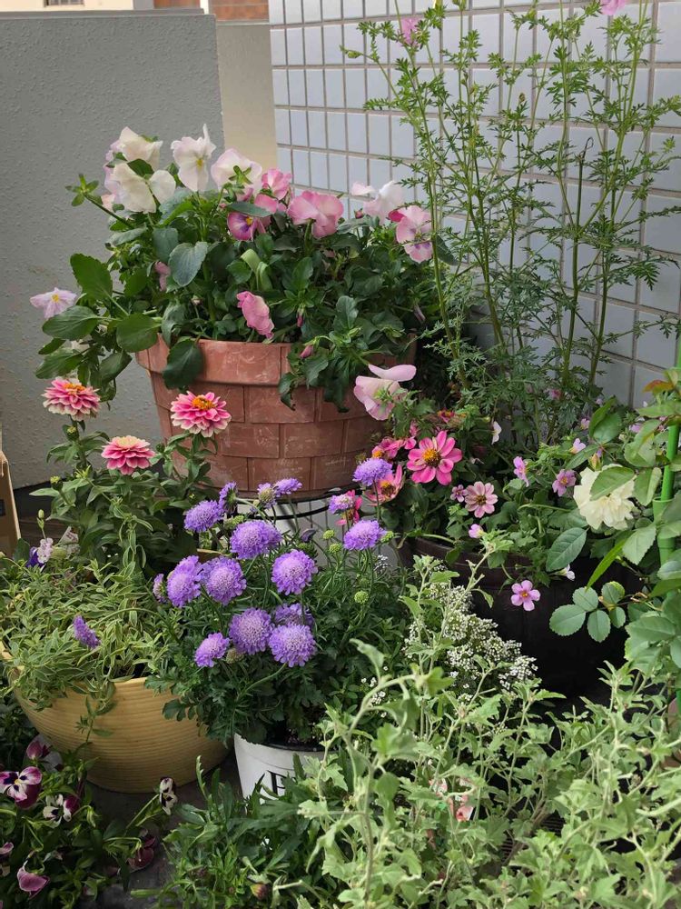バルコニーの花が多いエリアの一部🌼🌺💐まだパンジーが頑張っているので、去年の秋からのものが混在中。部屋から眺めて幸せ気分😊💕💕
