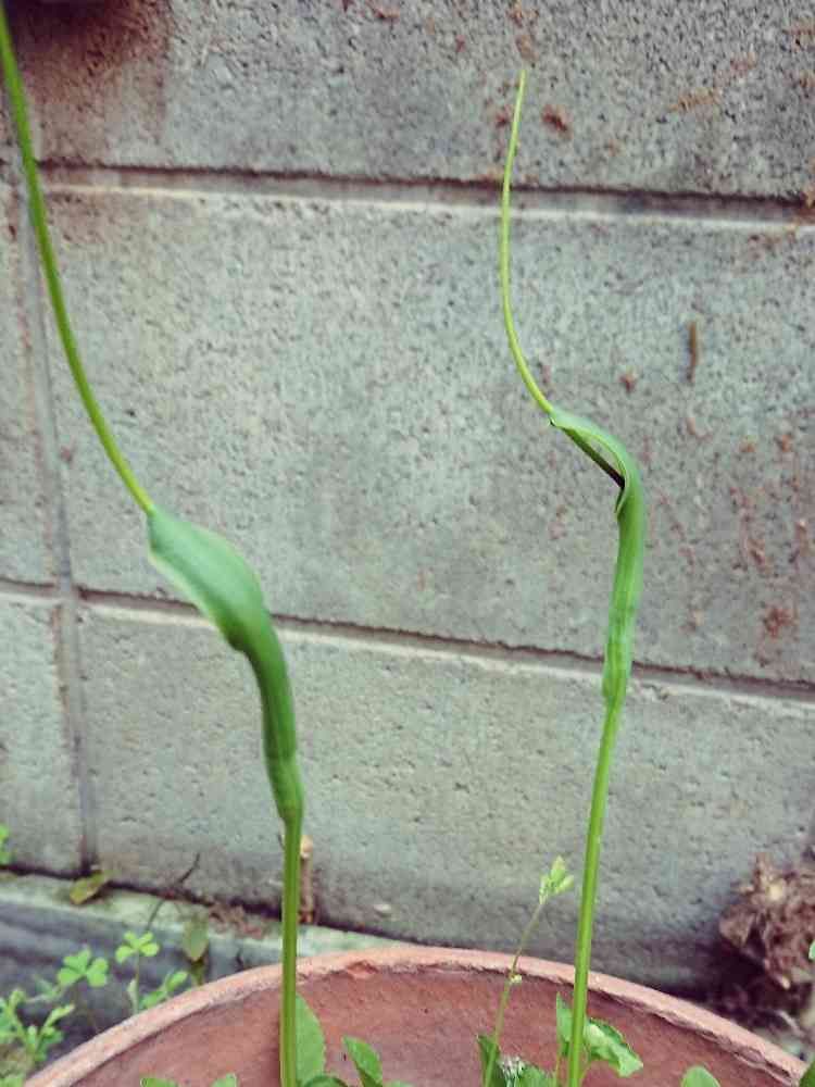 気づいたらカラスビシャクが、鉢の淵に、にょろにょろっと生えていました。