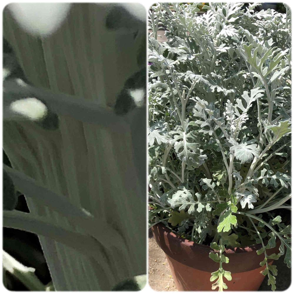 シロタエギクのつぼみを✂️しました。花を咲かせると弱くなるとのことで。ところが、葉を掻き分けると、なんとスラッとしているはずの茎が😱、幅2.5センチもありました。このままでいいのかなぁ❓