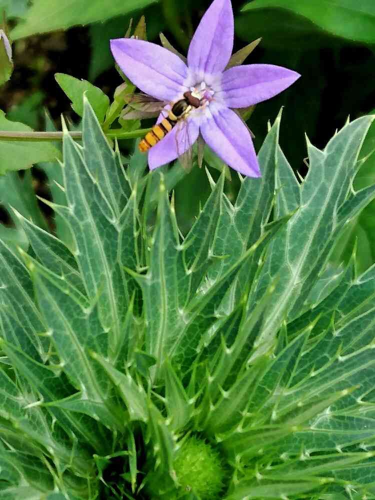 開花が始まったカンパニュラ/アルペンブルーの訪問者は、ホソヒラタアブさん🎵