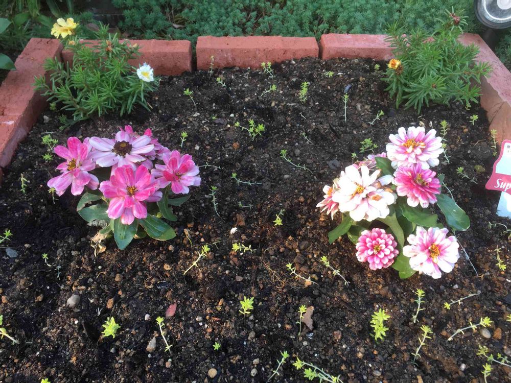 楽しませてくれたビオラにお礼を言って夏花に模様替え中、ビオラに代わりジニアとセダムと松葉牡丹を地植えしました。
