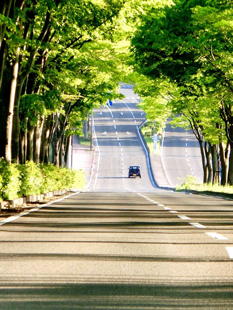 右より朝日が注ぎ路面がバーコード ⁇ ☀️