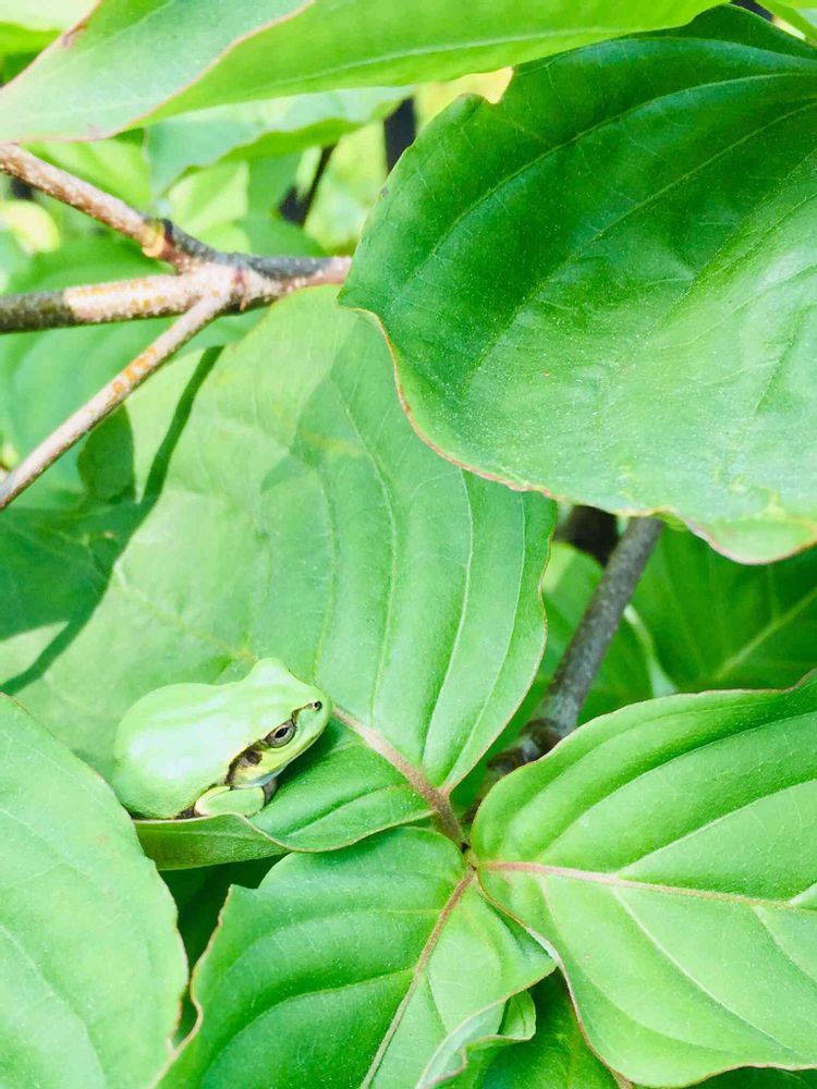ヤマボウシの葉陰に雨蛙🐸カメラを向けたらンッて見上げました😻