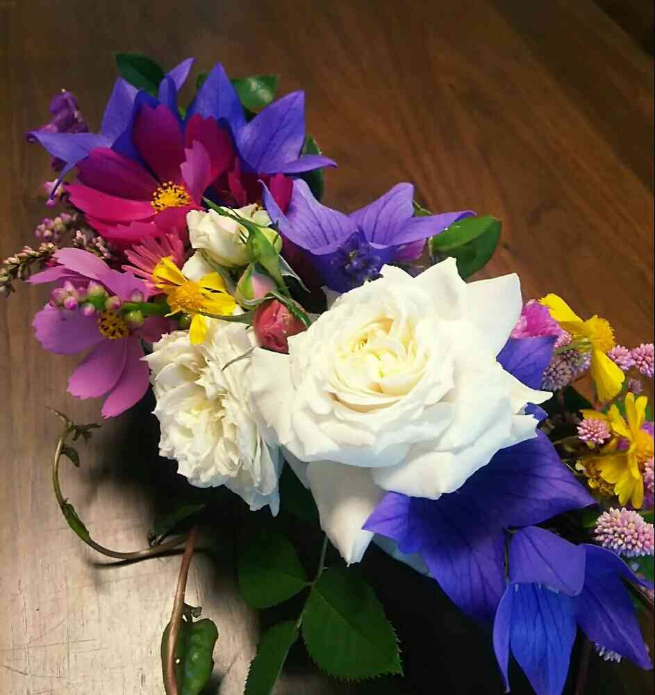 今日の夕食になる予定のツルムラサキと、庭のお花をあれやこれや突っ込んでみました(* ̄∇ ̄)ノ