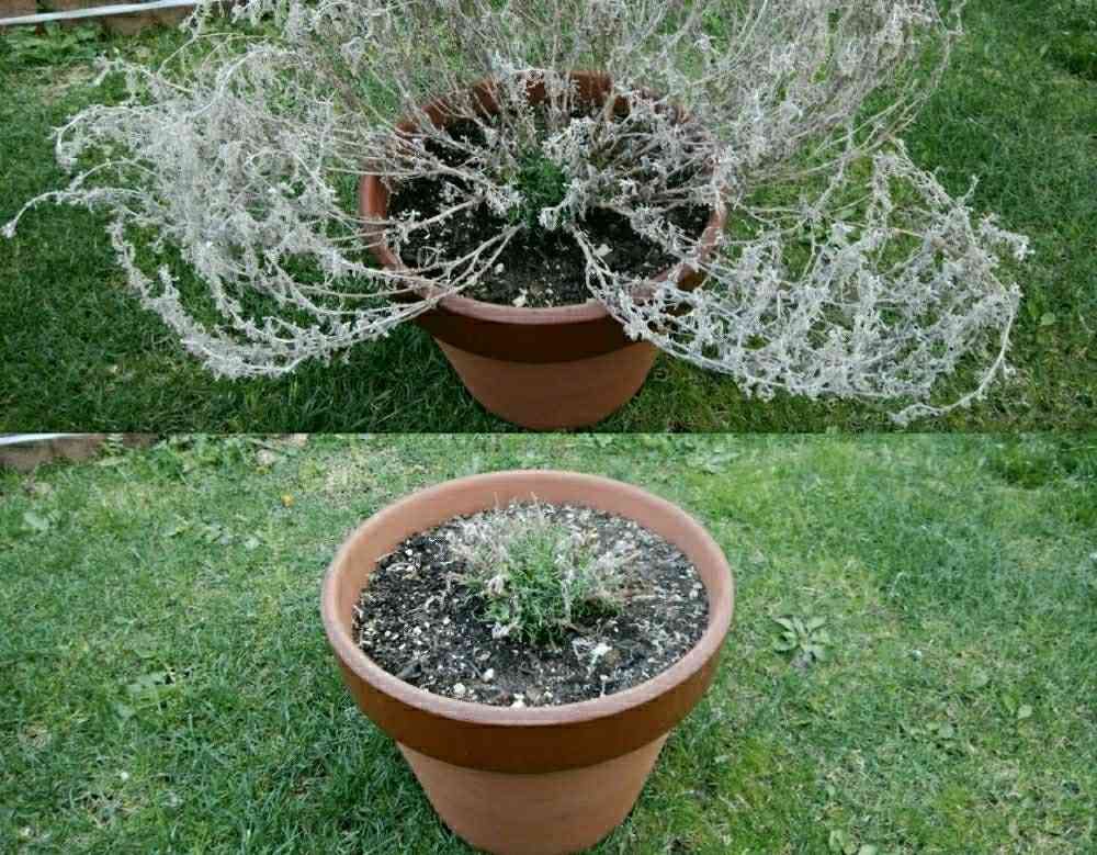 外での冬越しは地上部が全て枯れて、春に新芽の昨日剪定したサントリナグレー