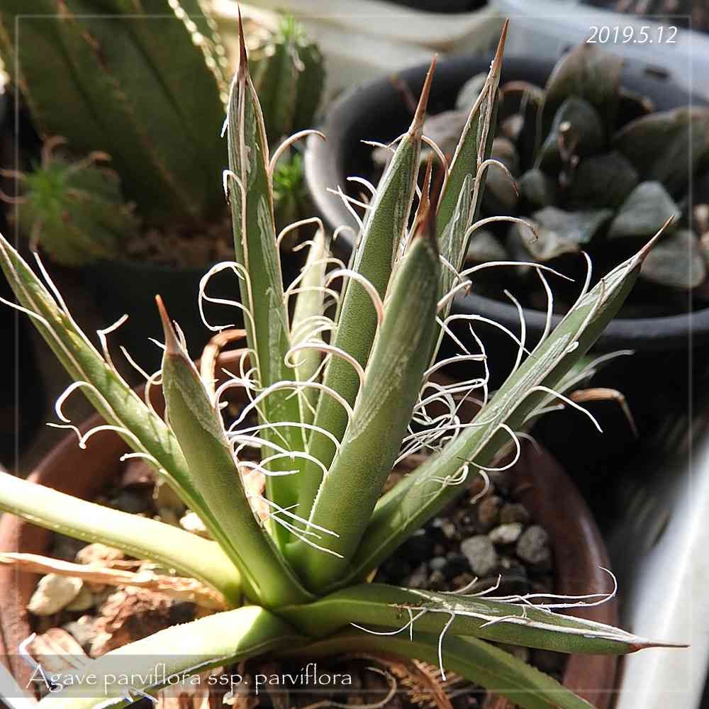 アガベ、姫乱れ雪。乱れ雪(フィリフェラ)の小型版だから「姫」乱れ雪(パル美フローラ)。葉の縁のフィラメントが繊細できれい。成長が遅い種類とのことだけど、もっと葉の数が増えるといいな。