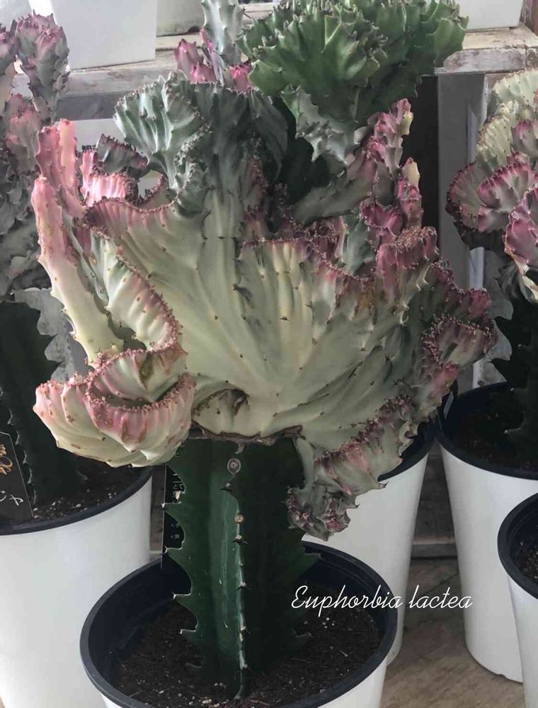「個性的でユニークな形が大人気!「綴化(せっか)」と言う、突然変異的な奇形でこんな形をしています。自ら育つ力が弱いので、同じユーフォルビアの「キリン角」という種類に接ぎ木してあり、タイで栽培されたものが輸入されています。」