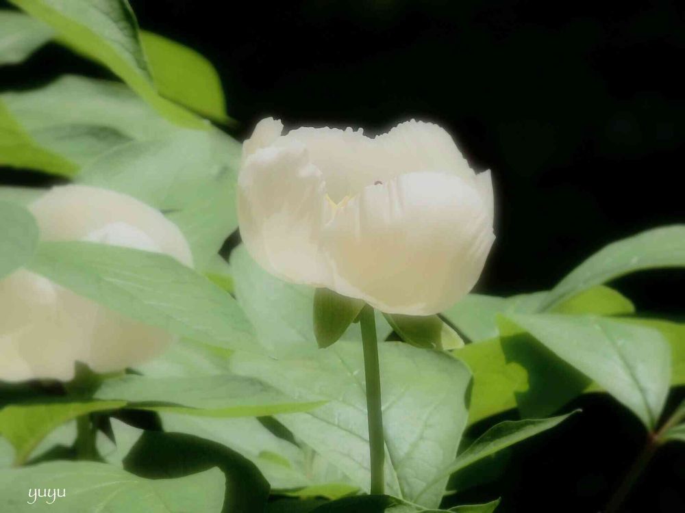 背景の黒がシャクヤクの白をとても引き立てていて素晴らしいお写真ですね🎶(´▽`)