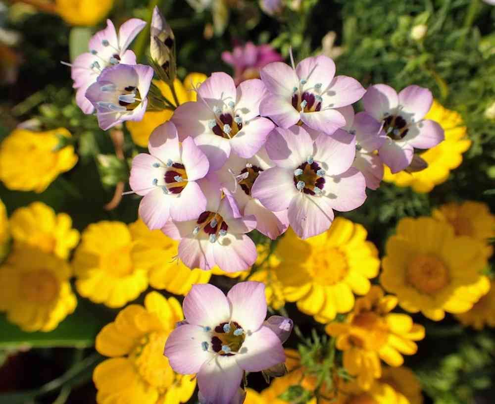 ギリア・トリコロールと、クリサンセマム・ムルチコーレです。ブルーの葯がまつ毛のようでかわいらしいですね👀